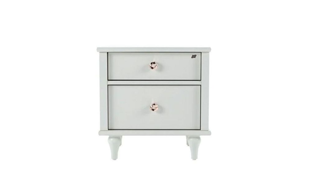 Κομψό παιδικό κομοδίνο με πόμολα σε μπρονζέ απόχρωση και δύο συρτάρια.