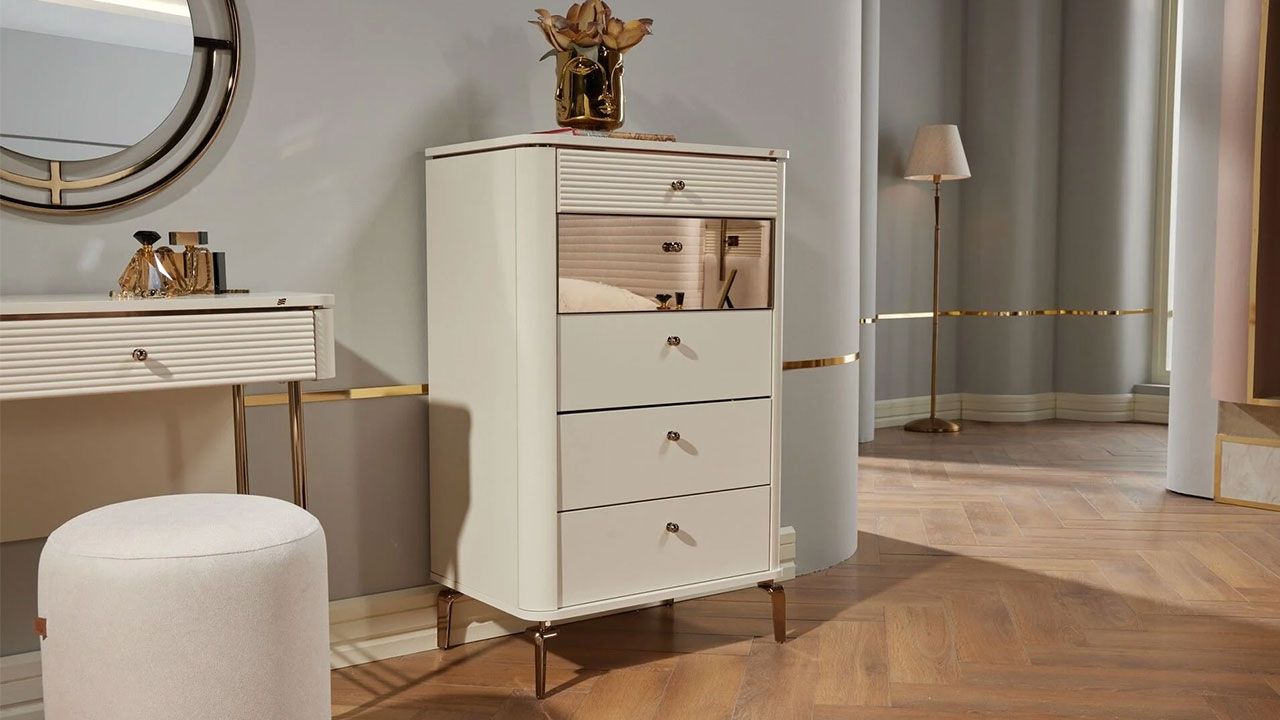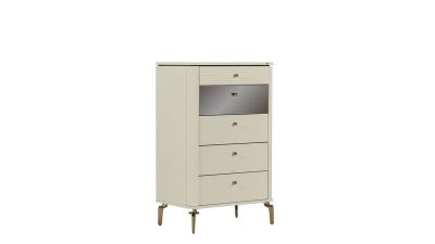 Συρταριέρα με εκλεπτυσμένη αισθητική και διακριτική πολυτέλεια. Οι καθαρές γραμμές, οι ανάγλυφες λεπτομέρειες στα συρτάρια και οι μεταλλικές πινελιές δημιουργούν ένα κομμάτι που ξεχωρίζει για την κομψότητα και την ισορροπία του.Τα λεπτά μεταλλικά πόδια προσθέτουν αίσθηση ελαφρότητας ενώ ο συνδυασμός υφών και φινιρισμάτων αναδεικνύει τον χώρο με διαχρονικό, elegant χαρακτήρα.