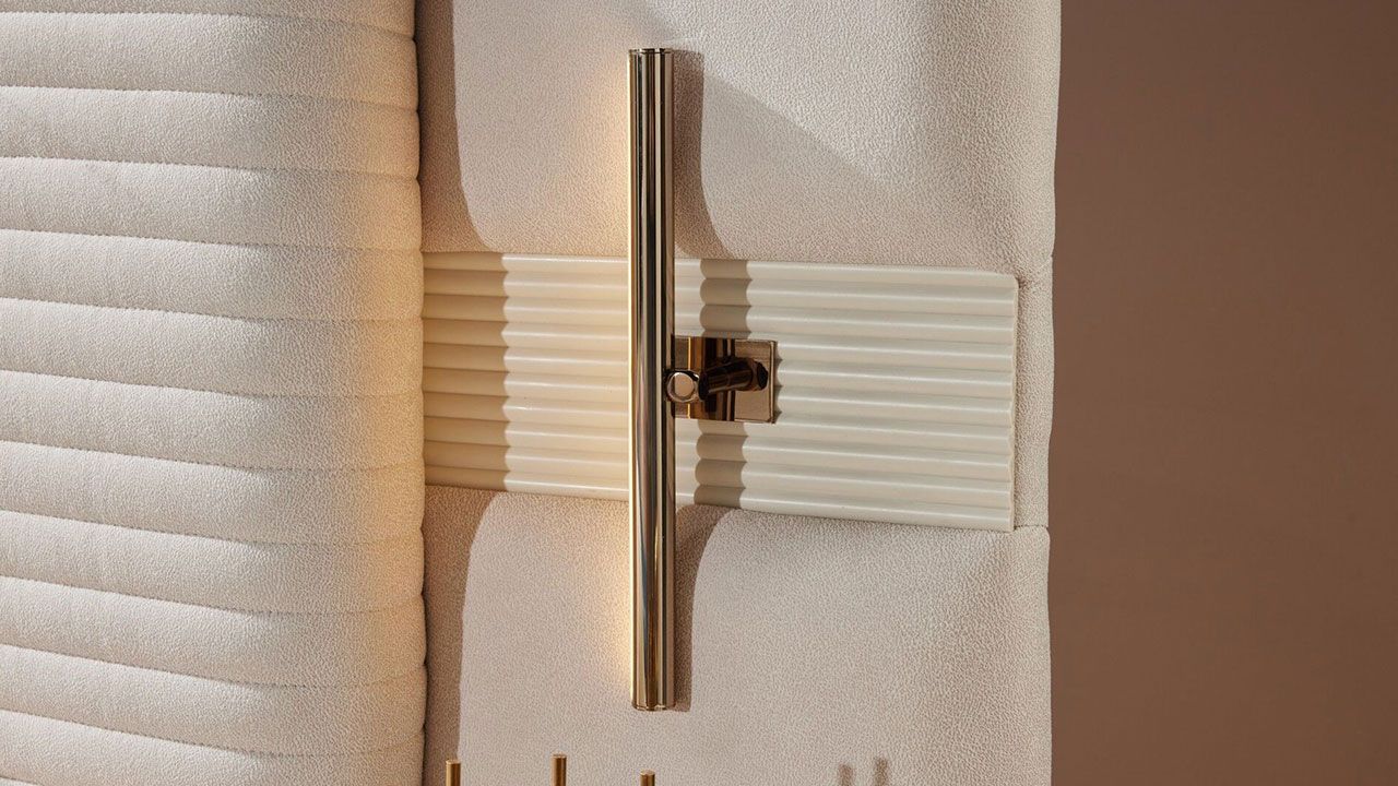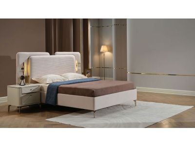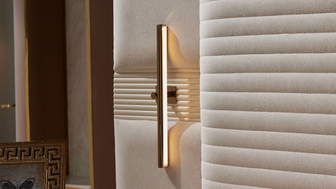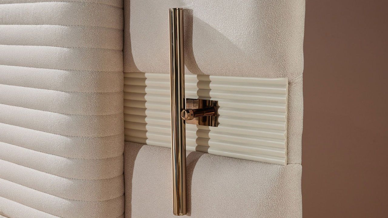 Απαλές καμπύλες στο κεφαλάρι με οριζόντια ραφή που δημιουργούν ένα εκλεπτυσμένο παιχνίδι υφής ενώ οι μεταλλικές λεπτομέρειες σε ζεστή χρυσή απόχρωση προσθέτουν λάμψη χωρίς υπερβολή. Ο ενσωματωμένος φωτισμός στο κεφαλάρι δημιουργεί μια ατμόσφαιρα ηρεμίας και χαλάρωσης αναδεικνύοντας τον χώρο του υπνοδωματίου με απαλό, ατμοσφαιρικό φως. Τα λεπτά μεταλλικά πόδια ενισχύουν τον ανάλαφρο χαρακτήρα του σχεδιασμού ενώ οι προσεγμένες γραμμές προσδίδουν ισορροπία και αρμονία.